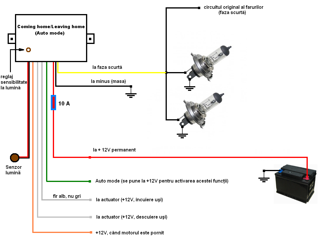 Auto mode - este o functie suplimentara a modulului, functie cu care modulul aprinde luminile automat, seara, dupa 10 secunde de la pornirea motorului. Luminile raman aprinse pana cand se opreste motorul sau pana cand lumina ambianta este suficienta pentru a se circula fara lumini. Cand se lumineaza brusc, modulul va stinge luminile doar dupa 30 de secunde.