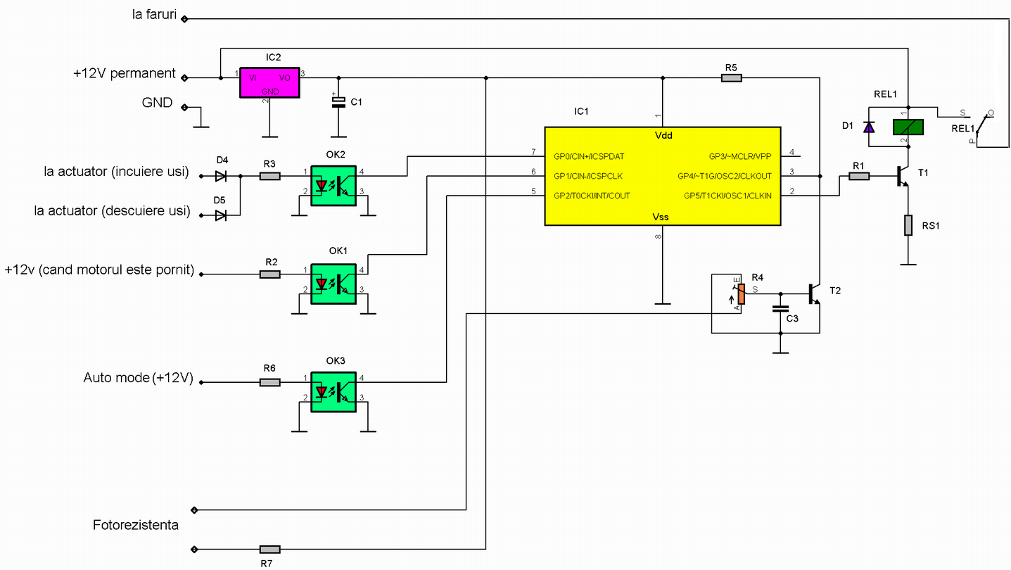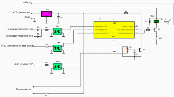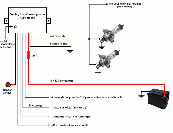 Circuitul aprinde farurile autoturismului (faza scurta, pozitii sau proiectoare - Halogen, Xenon, LED, CCFL), doar seara, atunci cand din telecomanda, se incuie/descuie usile. Timpul cat farurile raman aprinse este de 20 de secunde. Daca se pune contactul, luminile se sting, iar functia modulului este anulata. Daca nu este destul de intuneric (nivel reglabil din semireglabil), modulul nu aprinde luminile.