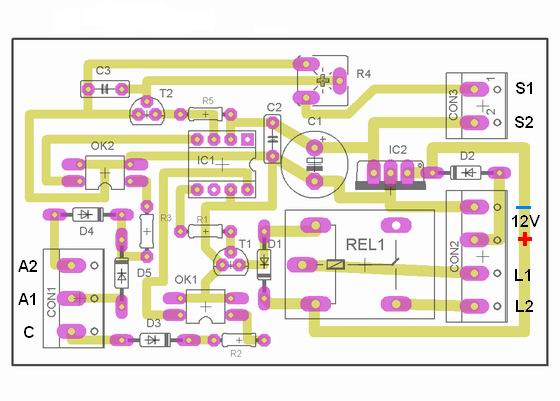 Cablajul imprimant si dispunerea componentelor (traseele sunt vazute prin transparenta)