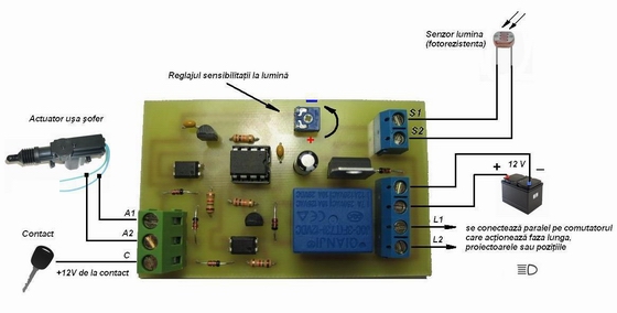 Circuitul aprinde farurile autoturismului (faza scurta, pozitii sau proiectoare - Halogen, Xenon, LED, CCFL), doar seara, atunci cand din telecomanda, se incuie/descuie usile. Timpul cat farurile raman aprinse poate fi reglat la 20 sec. sau la 40 sec. Daca se pune contactul, luminile se sting si nu pot fi aprinse decat daca se ia contactul. Daca nu este destul de intuneric (nivel reglabil din semireglabil), modulul nu aprinde luminile.
