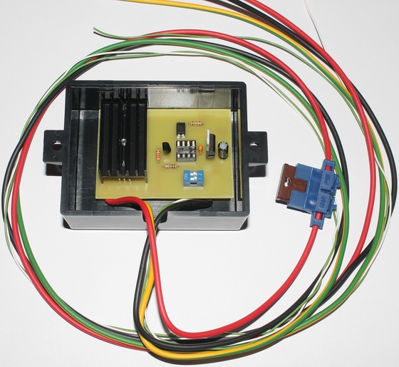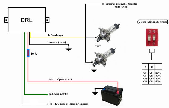 Circuitul aprinde farurile treptat (doar faza lunga), la o intensitate redusa (20%, 30%, 40% si 50%, setat din DIP switch), dupa 10 secunde de la pornirea motorului si stinge farurile cand se aprid pozitiile sau se opreste motorul. Circuitul este destinat autovehicolelor care, din fabrica, nu sunt prevazute cu DRL si care folosesc becuri cu halogen comandate cu tensiune pozitiva, pentru comanda fazei lungi a farurilor.