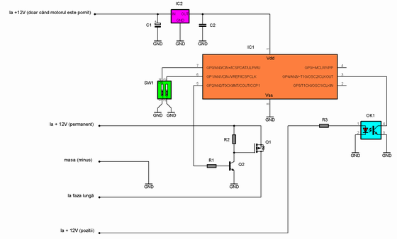 Lipirea componentelor pe cablajul imprimant se va face tinand cont de schema electrica, dispunerea componentelor si instructiunile de asamblare si lipire. Dupa operatia de lipire se introduce microcontrolerul IC1 in soclu, apoi se instaleaza circuitul in autoturism.