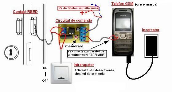Circuitul electronic actioneaza telefonul mobil pentru a apela un singur numar de telefon, atunci cand contactul magnetic este actionat de deschiderea usii.