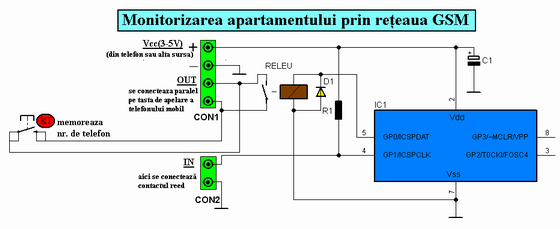 Componenta de baza a circuitului apelator/comunicator GSM este microcontrolerul PIC10F202, pe 8 biti, cu memorie program de tip Flash, cu un consum foarte redus. Pinul 5 al acestuia este configurat ca iesire, iar pinul 4 este setat ca intrare, unde R1 (10K) "trage" intrarea la plusul alimentarii. Programul scris īn memoria Pic-ului foloseste o bucla care verifica permanent starea intrarii IN (pin 4). Cānd intrarea IN este pusa la masa, programului iese din bucla si actioneza, prin pinul 5, de trei ori, la interval de aproximativ o secunda, releul reed, de 5V, iar la rāndul lui, releul, prin contactul normal deschis (OUT), īnchide circuitul electric al tastei de apelare al unui telefon mobil. Deoarece īntreg circuitul consuma extrem de putin, circuitul poate fi alimentat din telefon. Condensatorul electrolitic C1 (10 uF) decupleaza alimentarea, iar D1 (1N4148) protejeaza microcontrolerul de tensiunea inversa de autoinductie generata de bobina releului.