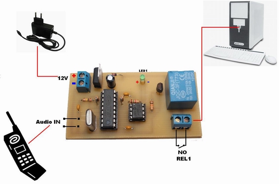 Jack-ul handsfree-ului se conecteaza la telefon, urmand sa se seteze, din meniul acelui telefon, nivelul sonor al tastelor la maxim. De pe telefon sa va tasta * urmat de un cod de patru cifre. Codul de patru cifre predefinit este 1234. La fiecare apasare a tastelor, daca codul DTMF este receptionat corect, LED1 se va aprinde. Dupa introducera secventei formata din * si codul de patru cifre, daca codul este corect, REL1 anclaseaza 5 secunde, iar prin contactul NO va inchide circuitul electric al butonului de pornire al PC-ului. Aceasta va avea ca efect pornirea Desktop PC-ului. Daca pana aici operatia de verificare decurge identic, atunci circuitul este functional si gata de utilizare.