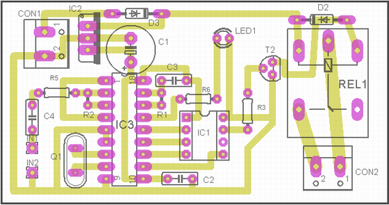 Lipirea componentelor pe cablajul imprimant se va face tinand cont de schema electrica, dispunerea componentelor si instructiunile de asamblare si lipire. Dupa operatia de lipire se va verifica buna functionare a circuitului, astfel: cu IC3 si IC1 scoase din soclu, se alimenteaza circuitul cu 12V DC, si se verifica valoarea tensiunii de alimentare la pinul 18 al lui IC3 si pinul 1 al lui IC1, tensiune care trebuie sa fie 5V DC. Mai departe, se va verifica circuitul releului REL1, prin punerea pinului 7 al lui IC1, la +5V, operatie ce are ca rezultat anclasarea lui REL 1, daca circuitul acestuia este functional.