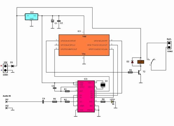 Pentru transmiterea comenzilor catre acest circuit sunt utilizate tonuri DTMF. Astfel, circuitul IC3, MT 8870, care este un receptor si decodor DTMF, detecteaza tonurile DTMF care ajung la intrarea IN AUDIO, de la telefon, apoi le decodifica in format binar. LED1 se aprinde doar atunci cand codul DTMF este receptionat corect. Microcontrolerul IC1, PIC 12F629 sau PIC 12F675, din codul binar de 4 biti al lui IC3, extrage doar codul echivalent al cifrelor 1, 2, 3, 4, 5, 6, 7, 8, 9, 0, *, # si, printr-un algoritm propriu, actioneaza timp de 5 secunde, releul REL1, prevazut cu un contact NO. Stabilizatorul IC2 stabilizeaza tensiunea de alimentare la 5V. Dioda D3 protejeaza circuitul la inversarea tensiunii de alimentare.