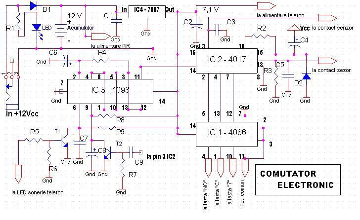 Schema electrica a comutatorului electronic este prezentata aici. IC4 asigura stabilizarea tensiunii de alimentare la valoarea de 7,1 V, care alimenteaza telefonul si comutatorul electronic. Stabilizatorul are intrarea si iesire decuplata de cei doi condesatori electrolitici C1 si C2. Tensiunea de intrare este asigurata de un alimentator extern, la 12 V, minim 600 mA, în tampon cu un acumulatorul de 12 V. Totodata, aceasta tensiune alimenteaza si detectorul PIR. Dioda D1 opreste descarcarea acumulatorului prin alimentator, iar dioda LED indica prezenta tensiunii de la alimentator împreuna cu rezistorul de limitare al curentului R1. Comutatorul electronic este realizat cu cele trei comutatoare bilaterale analogice A, B, D din IC1 de tip CMOS 4066. Comutatoarele sunt activate în ordine, unul cate unul, de catre IC2 de tip CMOS 4017, care este un numarator Johnson decadic. Intrarea acestui numarator primeste un semnal dreptunghiular produs de poarta 3 a IC3 de tip CMOS 4093, folosita ca oscilator a carui frecventa poate fi modificata din grupul R4 si C6. În cazul de fata durata acestui semnal este de aproximativ o secunda. Activarea succesiva a celor trei comutatoare A, B, D se produce atunci când pe intrarea CLOCK a numaratorului IC2, exista impulsuri de la IC3, si intrarea CLOCK INHIBIT de la IC2 este trecuta la nivel logic L . Trecerea in logic L are loc cand se deschide contactul normal inchis al PIR-ului sau al contactului magnetic, iar impulsurile sunt prezente la intrare doar atunci când tranzistorul T1 intra în conductie. T1 intra în conductie doar când led-ul de apel de la telefon se aprinde sau pâlpâie. Deoarece detectorul PIR deschide contactul doar un timp foarte scurt, este posibil ca numaratorul sa nu execute toate cele trei stari. Din acest motiv, logic H pentru blocarea numaratorului se ia de la iesirea Q0 (pin 3) al numaratorului. Cand PIR deschide contactul, iesirea Q0 (pin 3) a numaratorului trece din logic H în logic L . Trecerea in logic H se obtine fie prin resetarea numaratorului, stare care se produce la alimentarea montajului prin grupul C4 si D2, fie dupa ce numaratorul executa cele trei stari(Q1, Q2, Q3), nu zece câte are în total numaratorul. Stare Q4 reseteaza numaratorul prin R2, astfel numaratorul se inhiba doar dupa ce se executa cele trei stari care corespund activarii succesiva a celor trei comutatoare A, B, D.