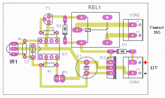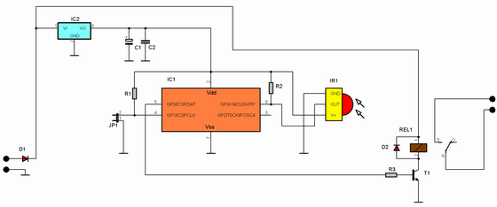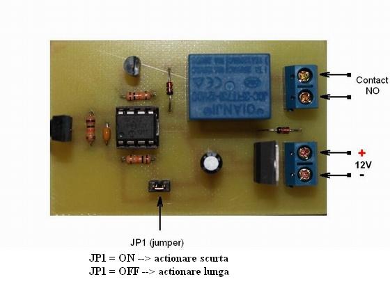 O telecomanda IR (infrarosu) oarecare (TV, DVD Player, CD Player etc.), impreuna cu acest circuit, ofera utilizatorului posibilitatea de a porni si/sau opri de la distanta, un echipament electric. Circuitul nu trebuie programat pentru a recunoaste cele doua comenzi, oprit si pornit. Pentru comanda de pornire se apasa scurt un buton, oricare, de la telecomnda utilizata, iar pentru oprire se apasa scurt acelasi buton sau altul. Circuitul este prevazut cu un jumper care seteaza timpul de raspuns al circuitului. Daca jumper-ul este ON, circuitul executa comenzile cand butonul telecomenzii se apasa scurt, iar cand jumper-ul este OFF, circuitul executa comenzile cand butonul telecomenzii se apasa lung, aproximativ 4 sec. Aceasta din urma setare se foloseste cand telecomanda folosita pentru circuit, este utilizata pentru un alt echipament sau cand in camera unde se afla circuitul, mai exista un echipament care foloseste o alta telecomanda.
