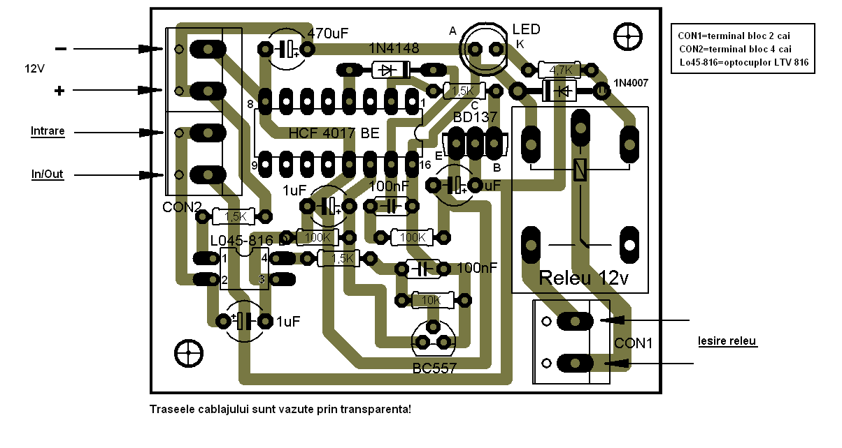 Cablajul imprimant si dispunerea componentelor (traseele sunt vazute prin transparenta)